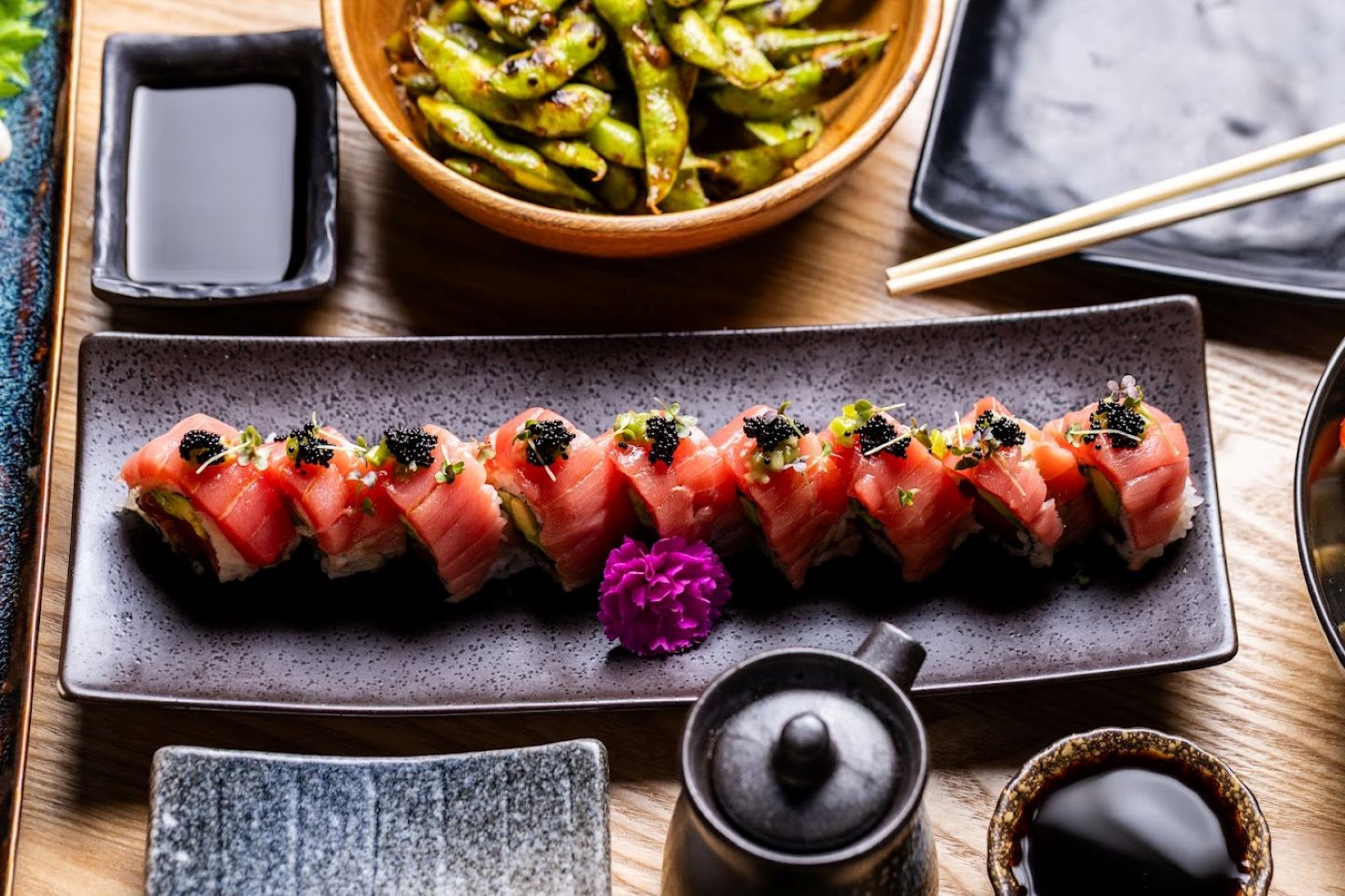 The menu features pristine sashimi, delicately sliced nigiri, signature rolls, and seasonal specialties prepared with carefully selected ingredients. Clean cuts, vibrant accents, and layered flavors define each plate, allowing the quality of the fish and the skill behind it to take center stage.